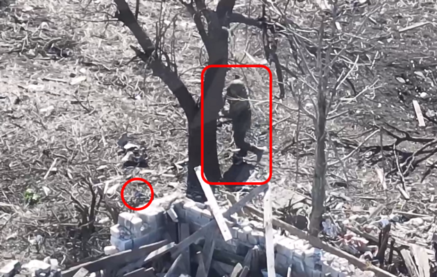 Российский военнослужащий пытался убежать от украинского FPV-дрона, который за мгновение до попадания в цель потерял управление. Когда беспилотник упал, россиянин кинул по нему автоматом, в результате чего сдетонировал боеприпас и оккупант погиб.