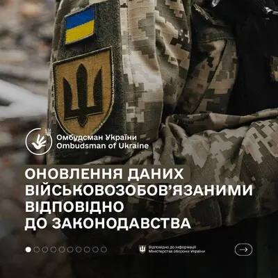 Омбудсман напоминает, что с 18 мая все военнообязанные должны обновить данные о себе. Для этого предоставляется 60 дней и три варианта обновления: ТЦК и СП, ЦНАП или электронное приложение "Резерв+".