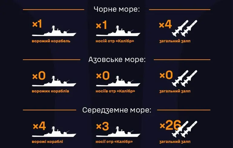 Тем временем в Средиземном море зафиксированы четыре вражеских корабля, из которых три являются носителями крылатых ракет "Калибр" общим залпом до 26 ракет.