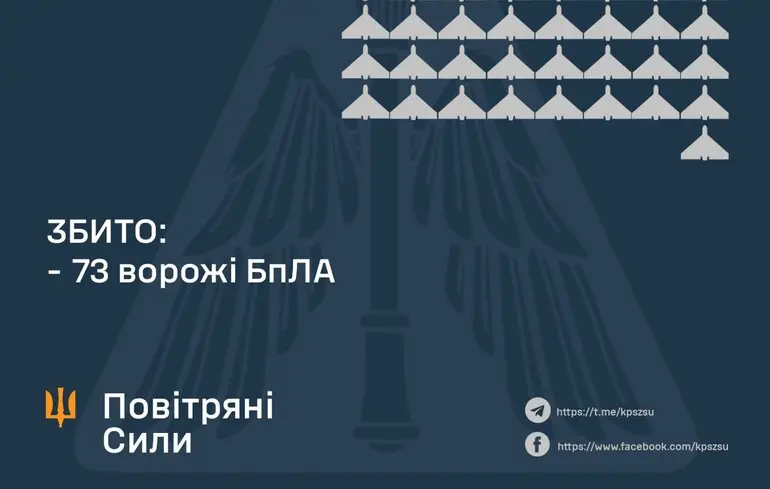 По состоянию на 09.00 подтверждено уничтожение 73-х ударных БпЛА типа Shahed и беспилотников других типов в Харьковской, Полтавской, Сумской, Черниговской, Черкасской, Киевской, Кировоградской, Житомирской, Хмельницкой, Днепропетровской, Запорожской и Николаевской областях.