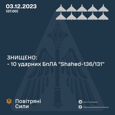 В результате боевой работы противовоздушная оборона Воздушных Сил и Сил обороны Украины уничтожила 10 ударных БПЛА Shahed-136/131. Управляемая авиационная ракета Х-59 не достигла своей цели.