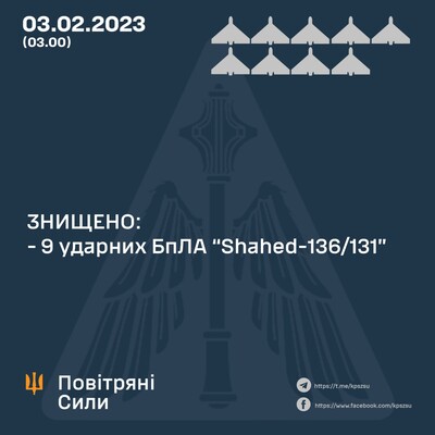 В ночь на 3 февраля россияне атаковали Украину, применив 14 ударных БпЛА типа Shahed-136/131 по двум направлениям: Приморско-Ахтарск – РФ и Чауда – Крым. Затем они ударили двумя управляемыми авиационными ракетами Х-59 из Белгородской области РФ. Об этом Командование Воздушных Сил ВСУ сообщило в Telegram.