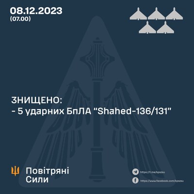Силами и средствами Воздушных Сил, во взаимодействии с ПВО Сил обороны Украины, уничтожены пять ударных БПЛА противника.