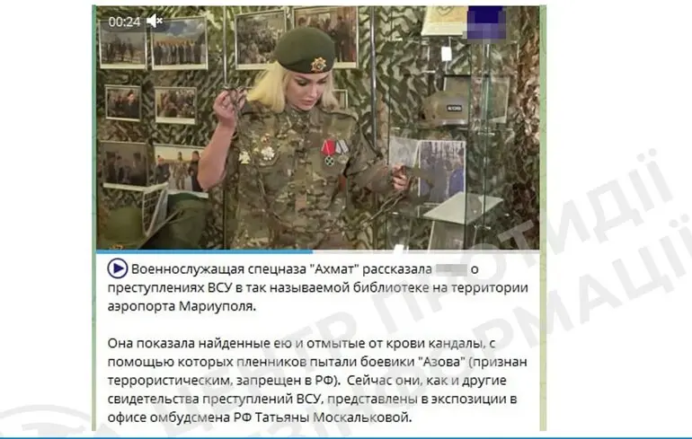 Яркий пример, который приводят эксперты ЦПД: российская пропаганда сообщает о выставке в офисе омбудсмена РФ, посвященной "застенкам "Азова" в Мариуполе". Центральный экспонат — кандалы, в которые якобы заковывали мирных жителей города.