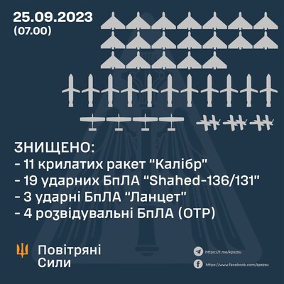 В ночь на 25 сентября российские войска нанесли удар по Украине крылатыми ракетами «Калибр», противокорабельными ракетами П-800 «Оникс» и ударными БпЛА типа «Shahed».
