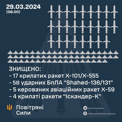 Ранее сообщалось, что сегодня, 29 марта, около 3:20 россияне запустили по Украине крылатые ракеты с бомбардировщиков ТУ-95мс из района Энгельса. Затем, около пяти часов утра они ударили "Кинжалами". В то же время, начиная с 20.37 28 марта, россияне атаковали Украину "шахедами".