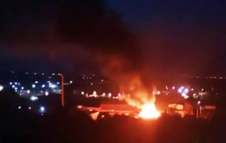 В районе завода идет дым. Он виден из разных частей города. Также сообщается, что возгорание началось в нескольких жилых домах. В настоящее время в городе работают пожарные.