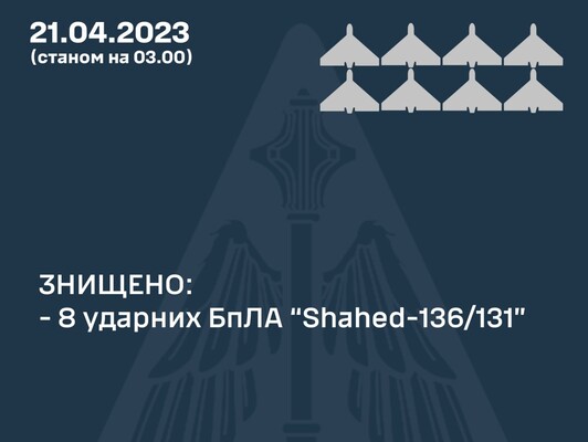 Во время российской атаки на Украину дронами-камикадзе иранского производства в ночь на 21 апреля силами Воздушной обороны было уничтожено восемь БПЛА «Shahed-136/131» из двенадцати, сообщило утром Командование Воздушных Сил Вооруженных Сил Украины.