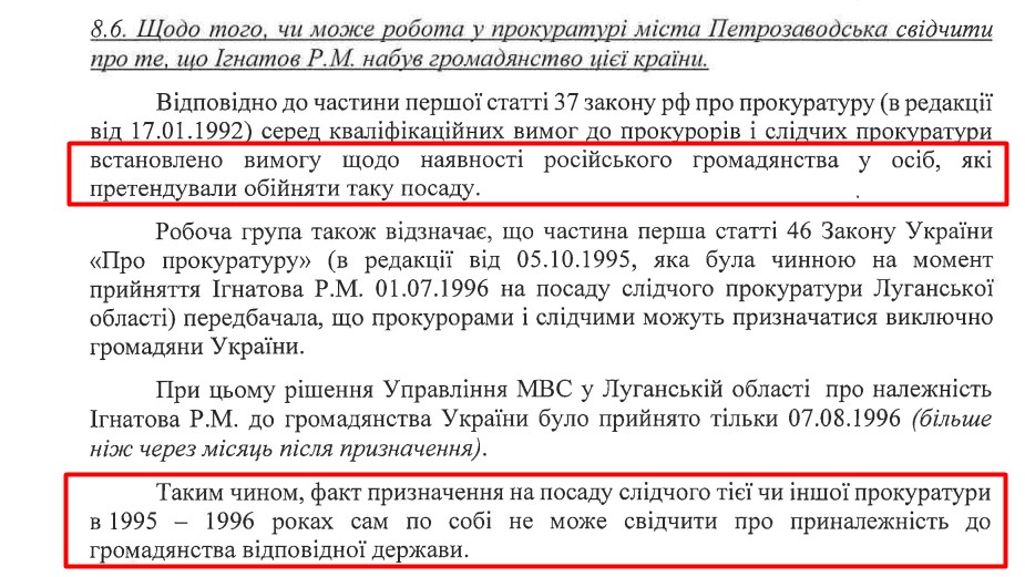Рабочая группа, оценивая, может ли работа в прокуратуре Петрозаводска свидетельствовать о том, что Игнатов вступил в гражданство РФ, отметила в отчете, что в статье 37 закона РФ о прокуратуре «установлено требование о наличии российского гражданства у лиц, претендовавших на эту должность», но отметила, что «факт назначения на должность следователя той или иной прокуратуры в 1995-1996 годах сам по себе не может свидетельствовать о принадлежности к гражданству соответствующего государства».