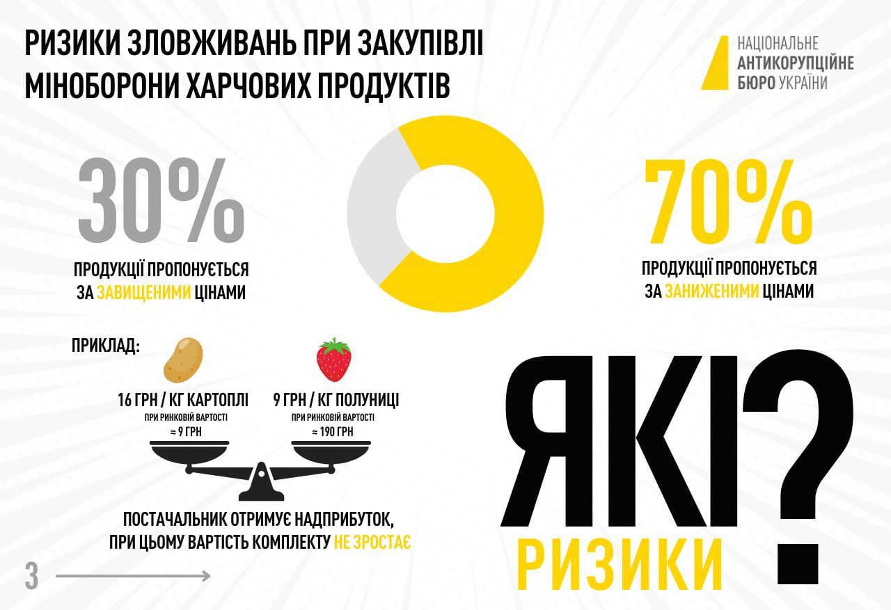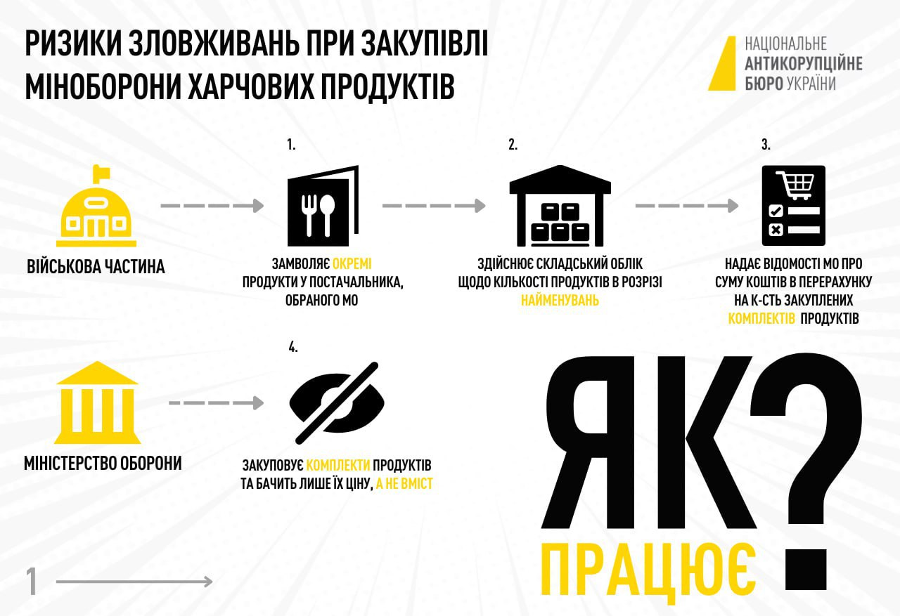 В НАБУ добавили, что, прежде всего, выявили предпосылки, позволяющие значительно завышать цены на определенные категории продуктов и сформировали рекомендации Минобороны, чтобы «прикрыть» эти коррупционные схемы.