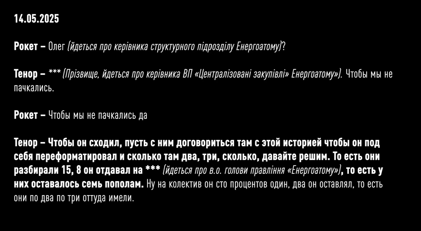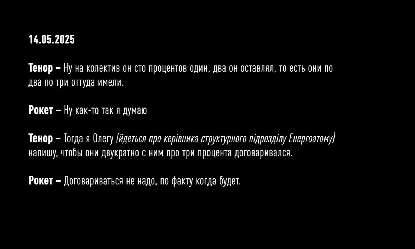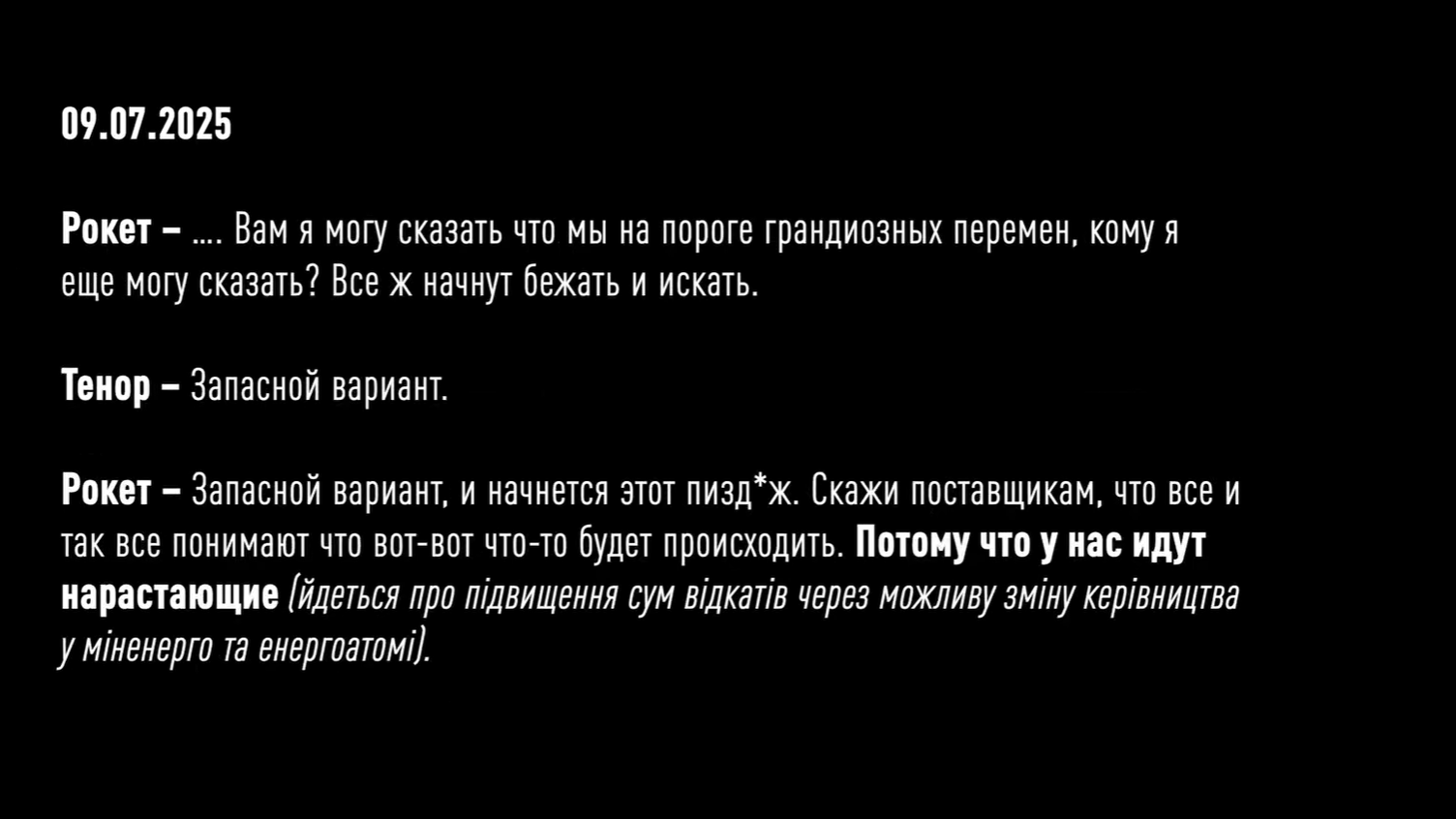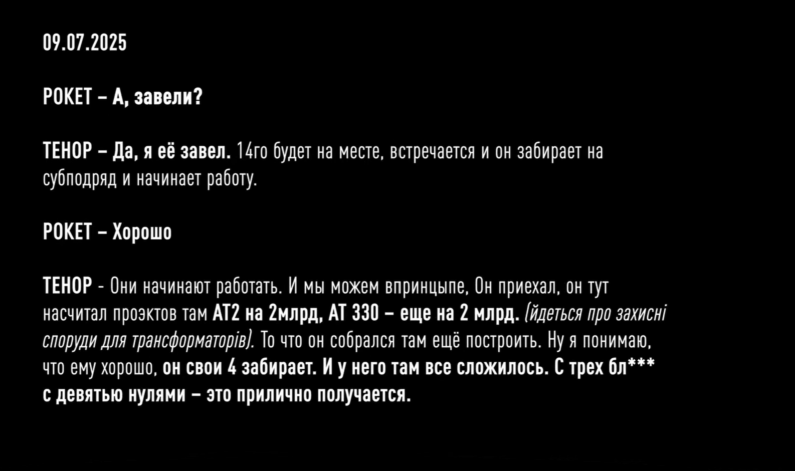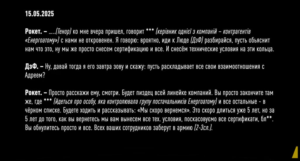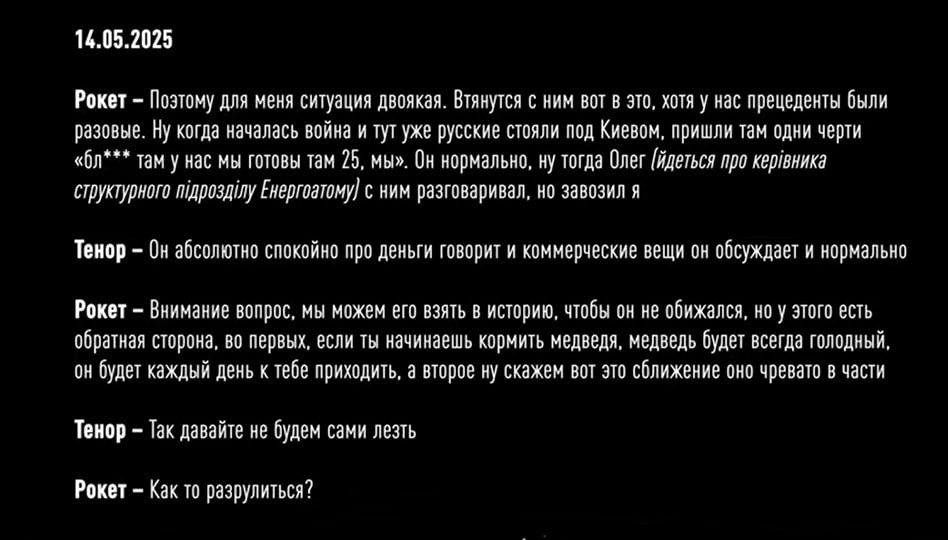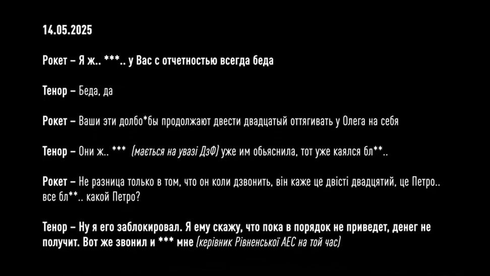 Более того, на пленках зафиксировали, как Рокет и Тенор обсуждают будущий проект на 4 млрд гривен по защите трансформаторных подстанций АТ-2 и АТ-330. В частности, они жалуются, что за предыдущий контракт стоимостью 3 млрд грн получили только 90 тысяч долларов или миллионов гривен. Установить сумму конкретнее детективы пока не смогли. Но учитывая то, что средний откат у них был 10-15%, Рокет и Тенор решают подождать более выгодного предложения еще месяц. Такое "решение" по данным НАБУ фигуранты приняли в сентябре этого года - во время массированных атак по нашей энергоинфраструктуре со стороны РФ. А уже 10 октября 2025 года, в тот момент, когда президент Украины собирает совещание по защите энергетических объектов, члены преступной организации обсуждают, как им поднять процент с 10 до 15 при строительстве защитных сооружений на Хмельницкой АЭС.
