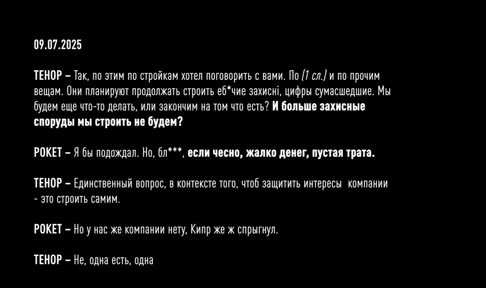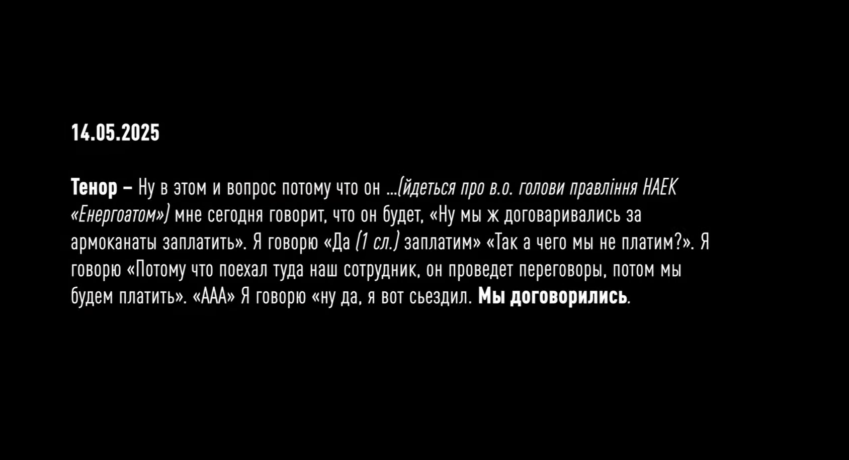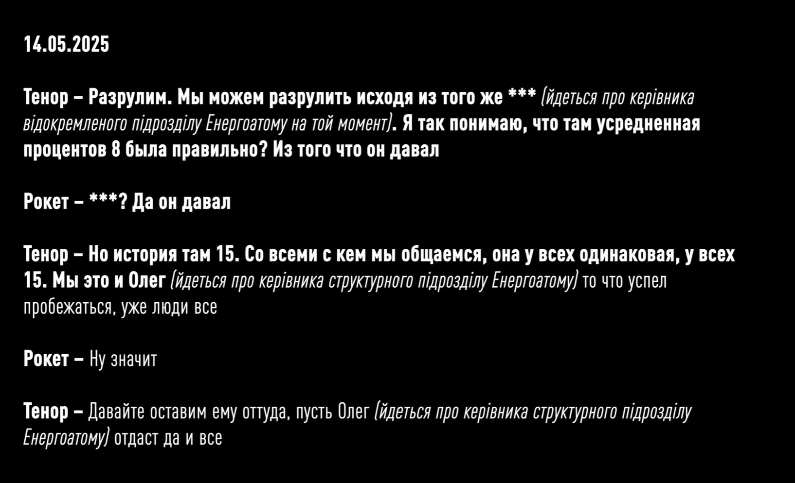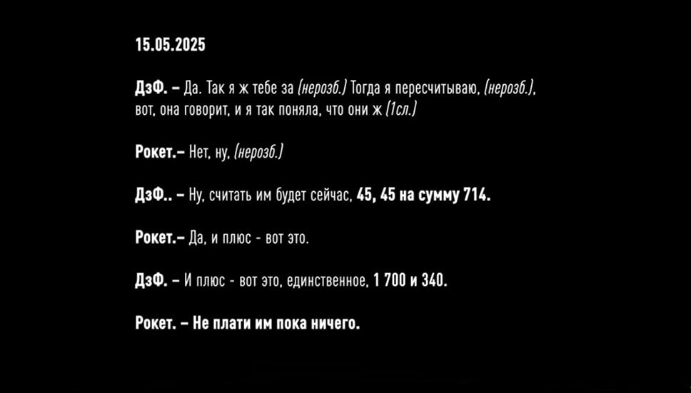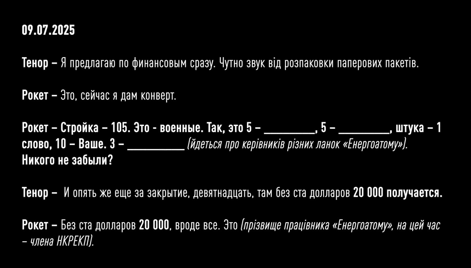 Более того, на пленках зафиксировали, как Рокет и Тенор обсуждают будущий проект на 4 млрд гривен по защите трансформаторных подстанций АТ-2 и АТ-330. В частности, они жалуются, что за предыдущий контракт стоимостью 3 млрд грн получили только 90 тысяч долларов или миллионов гривен. Установить сумму конкретнее детективы пока не смогли. Но учитывая то, что средний откат у них был 10-15%, Рокет и Тенор решают подождать более выгодного предложения еще месяц. Такое "решение" по данным НАБУ фигуранты приняли в сентябре этого года - во время массированных атак по нашей энергоинфраструктуре со стороны РФ. А уже 10 октября 2025 года, в тот момент, когда президент Украины собирает совещание по защите энергетических объектов, члены преступной организации обсуждают, как им поднять процент с 10 до 15 при строительстве защитных сооружений на Хмельницкой АЭС.