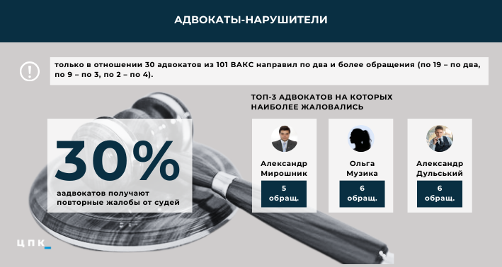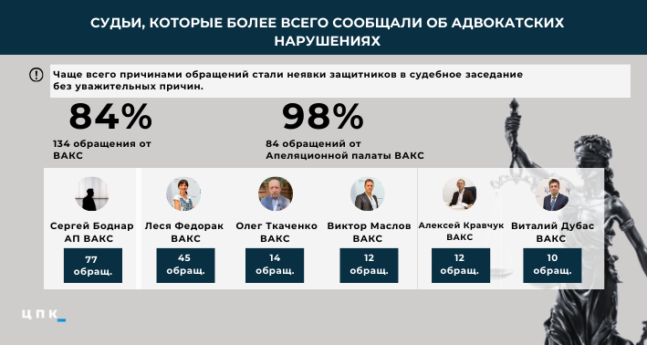 Чаще всего в органы квалификационно-дисциплинарной комиссии адвокатуры обращались коллегии, где председательствовала судья ВАКС Леся Федорак, — 45 обращений (28,48% от общего количества). В пятерку лидеров по этому показателю входят также судьи: Олег Ткаченко — 14 обращений, Виктор Маслов и Алексей Кравчук — по 12 и Виктор Дубас — 10 обращений.