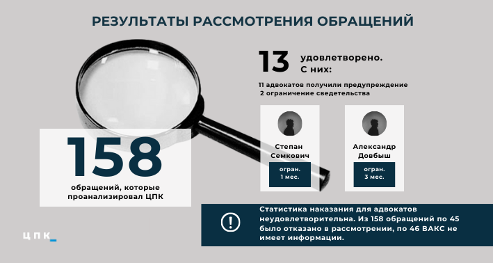 В 11 случаях из 13 квалификационно-дисциплинарные комиссии адвокатуры ограничились предупреждением, еще двум адвокатам временно остановили действие адвокатского свидетельства. Например, адвокату Степану Семковичу остановили право на занятие адвокатской деятельностью на месяц, а Александру Довбышу — на три месяца. Обоих защитников наказали за неявку в судебное заседание без уважительных причин.