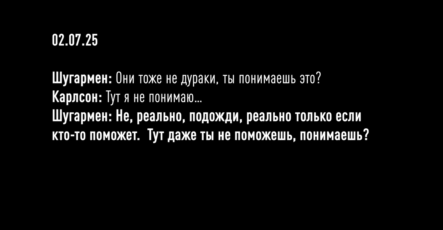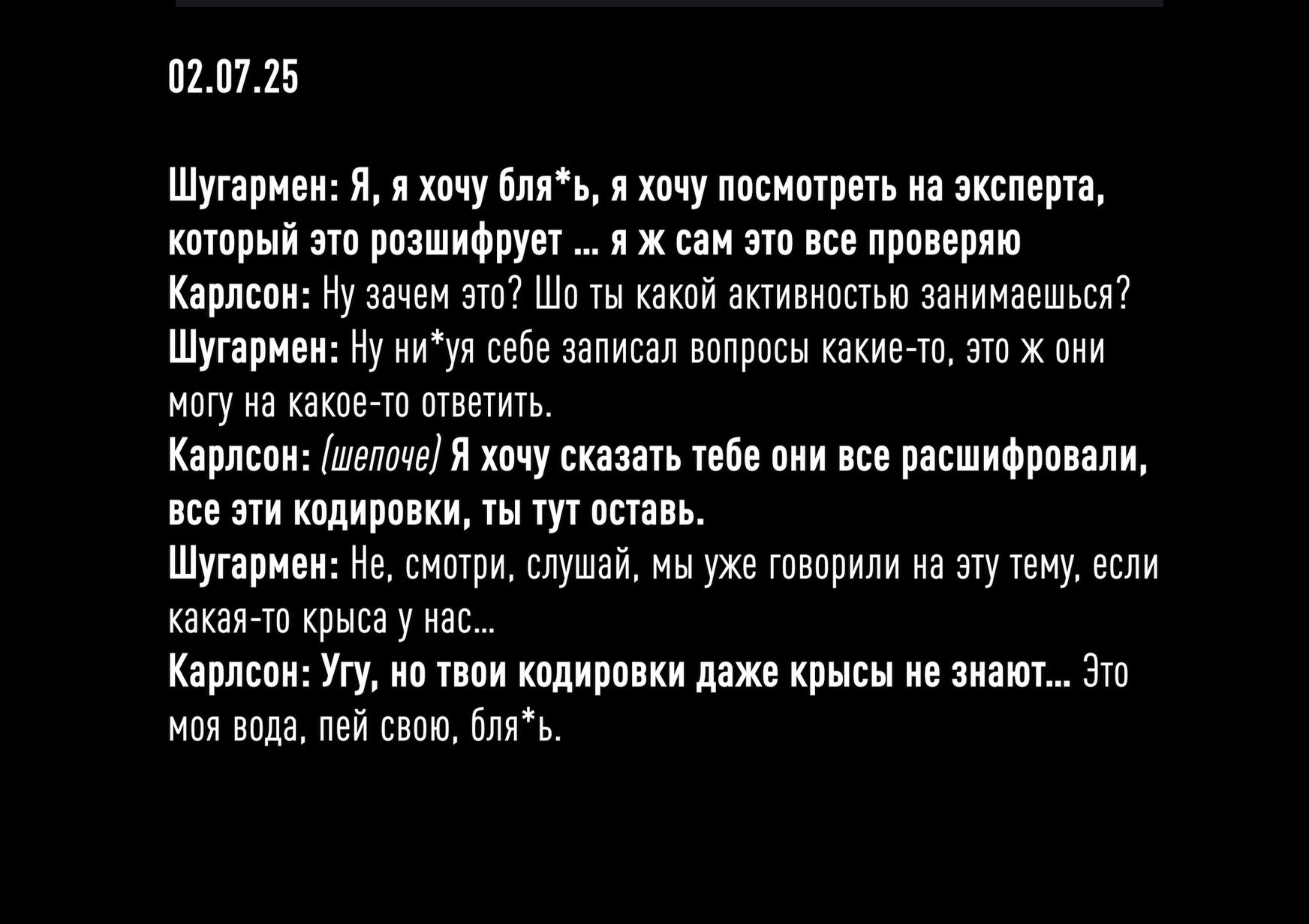 В свою очередь Шугармен передает средства, как и обещал во время предыдущей встречи. Тогда как Карлсон на одной из записей указывает Шугармену на необходимость жизни мер безопасности, ведь "не хочется получить подозрение".