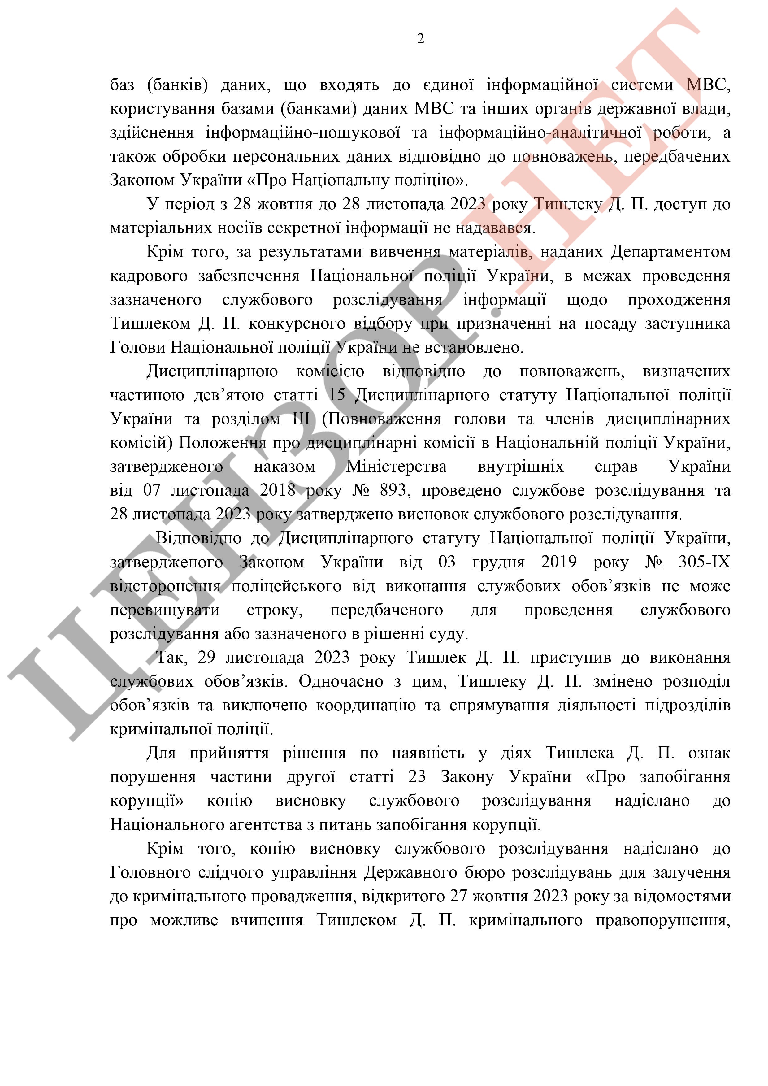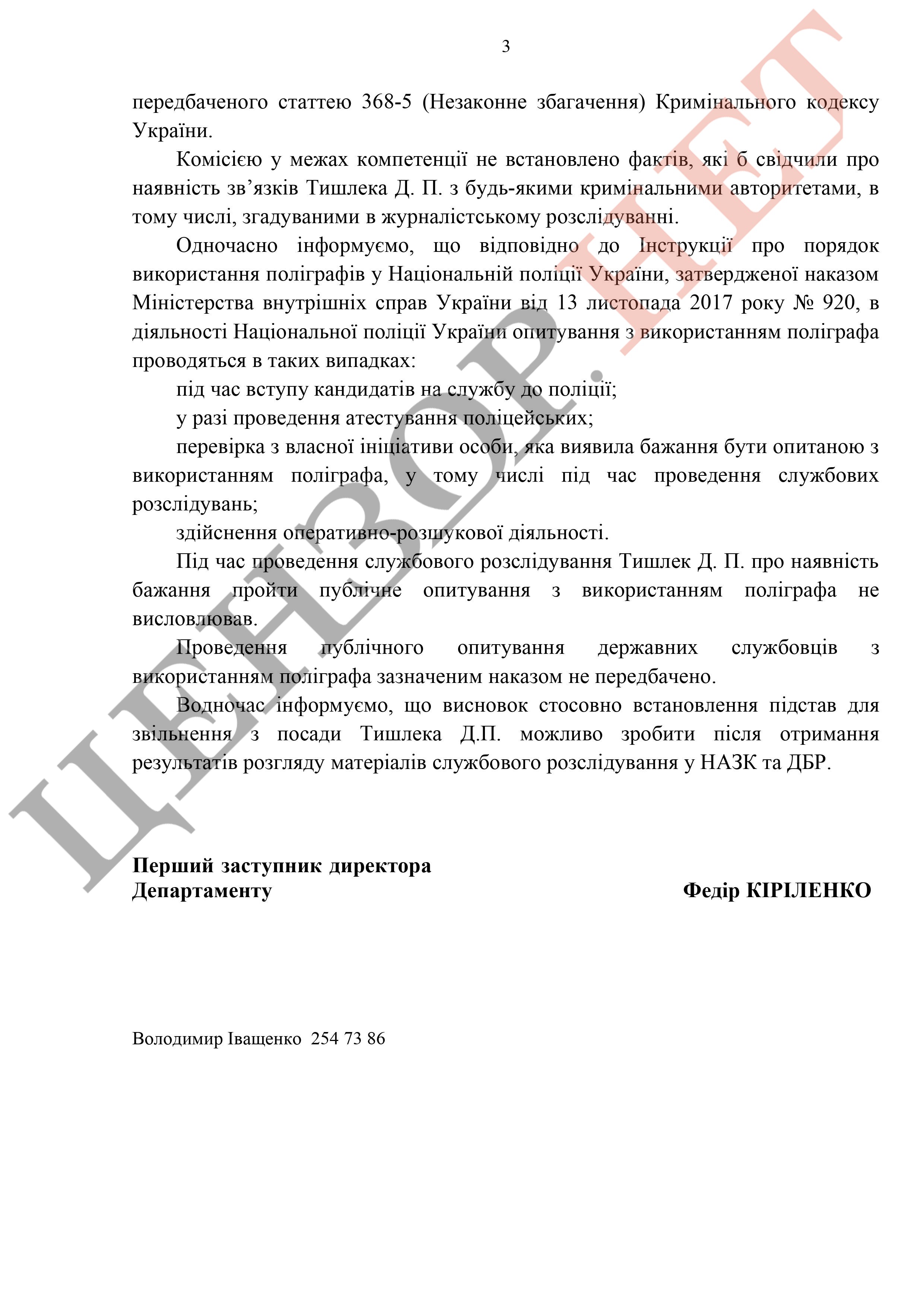 В то же время в МВД отметили, что вывод об установлении оснований для освобождения от должности Тишлека можно сделать после получения результатов рассмотрения материалов служебного расследования в НАПК и ДБР.