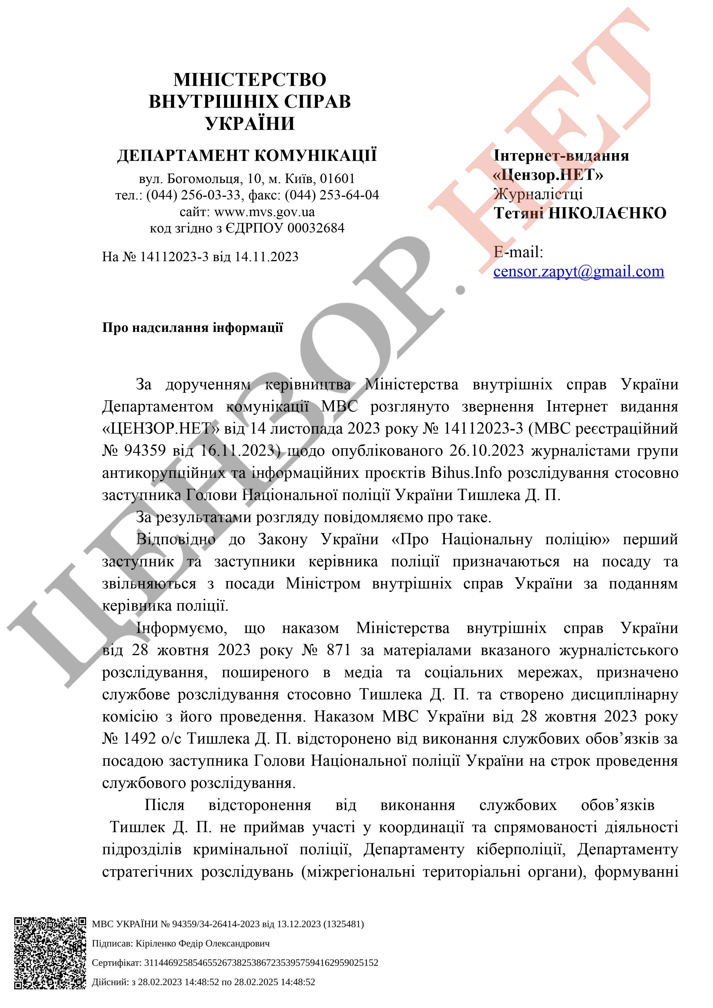 Об этом говорится в ответе Министерства внутренних дел Украины на запрос Цензор.НЕТ. На время расследования с 28 октября по 28 ноября Тишлека отстранили от должности. А 29 ноября он вернулся к работе, однако ему изменили распределение обязанностей, а также исключили координацию и направление деятельности подразделений криминальной полиции.