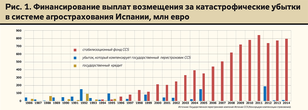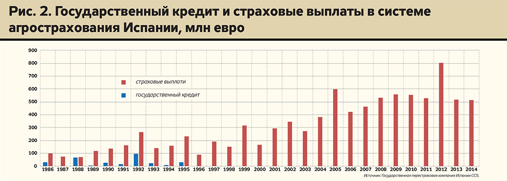 На рис. 1 показано, как постепенно сокращалось государственное финансирование выплат по катастрофическим убыткам в испанской системе агрострахования в процессе того, как накапливались средства в стабилизационном фонде, который формировался за счет катастрофического сбора со страховых премий. Государственный кредит на эти цели, игравший значительную роль в начале существования системы, практически стал ненужен благодаря многолетнему профициту стабилизационного аграрного фонда. Сравнить объем государственного кредита на покрытие катастрофических убытков и общий объем выплат страхового возмещения можно на рис. 2. Так, в 2014 г. испанская система агрострахования выплатила страховое возмещение на сумму 510 млн евро. При этом государственный кредит составил 1500 евро, причем это было сделано с символической целью.