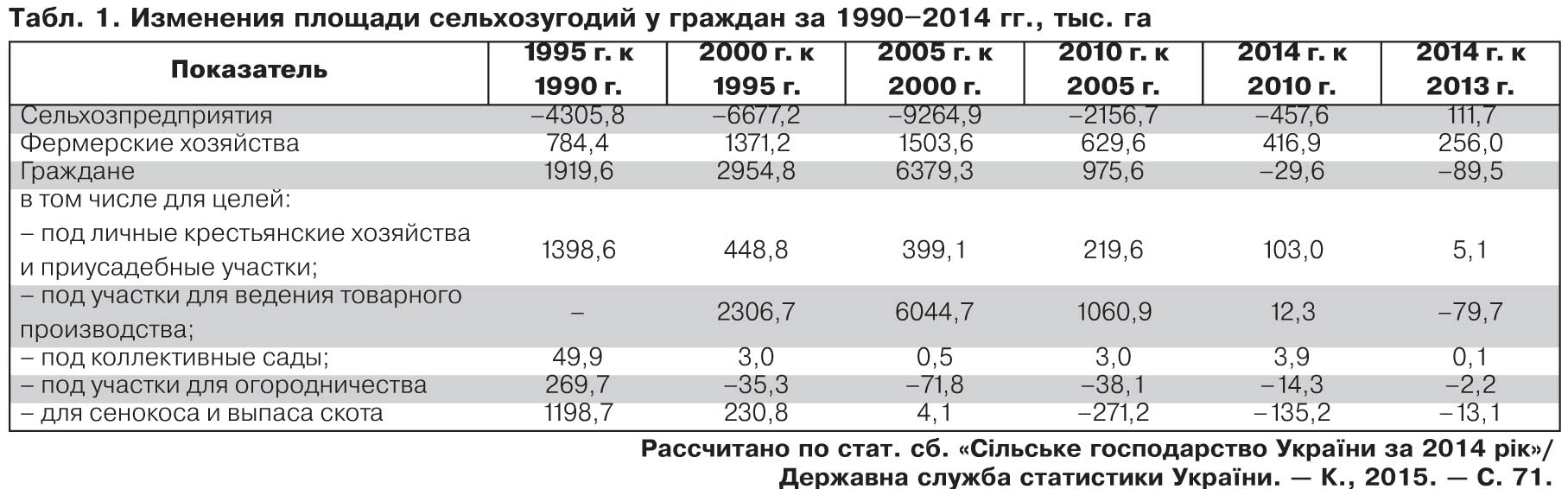 В 2014 г. впервые за период с начала реформы уменьшилась площадь земель у граждан для ведения товарного производства. Площадь земель под сенокос и выпас скота сократилась за последние восемь лет на 400 тыс. га, а для огородничества - на 160 тыс. га, или почти вдвое за 20 лет (см. табл. 1).