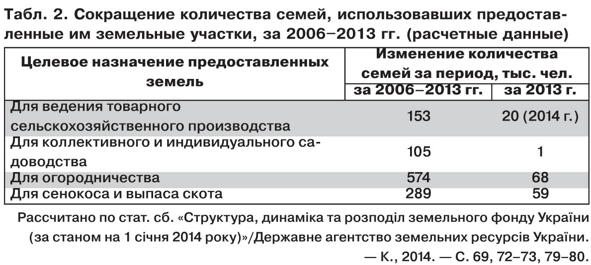 Поражает сокращение количества семей, оставшихся без тех или иных земельных участков, на которых они производили продовольствие для самообеспечения и реализации излишков на рынках (см. табл. 2).