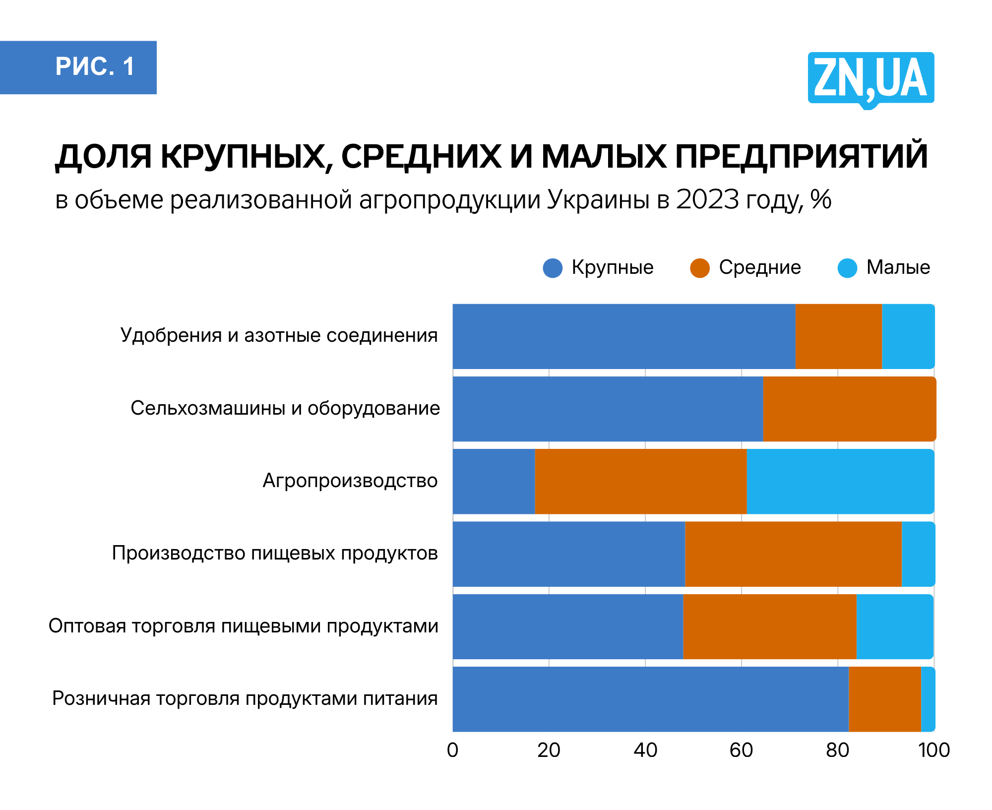 Существующие проблемы АПК во многом связаны с неравноправным положением сельскохозяйственных производителей в системе агропромышленных рынков. Это обусловлено в первую очередь структурой данных рынков. Как видно на рис. 1, на большинстве рынков, смежных по отношению к рынкам сельхозпродукции, господствуют крупные предприятия. При этом приведенные данные завышают уровень концентрации в аграрном секторе, где около трети продукции производится в хозяйствах населения.