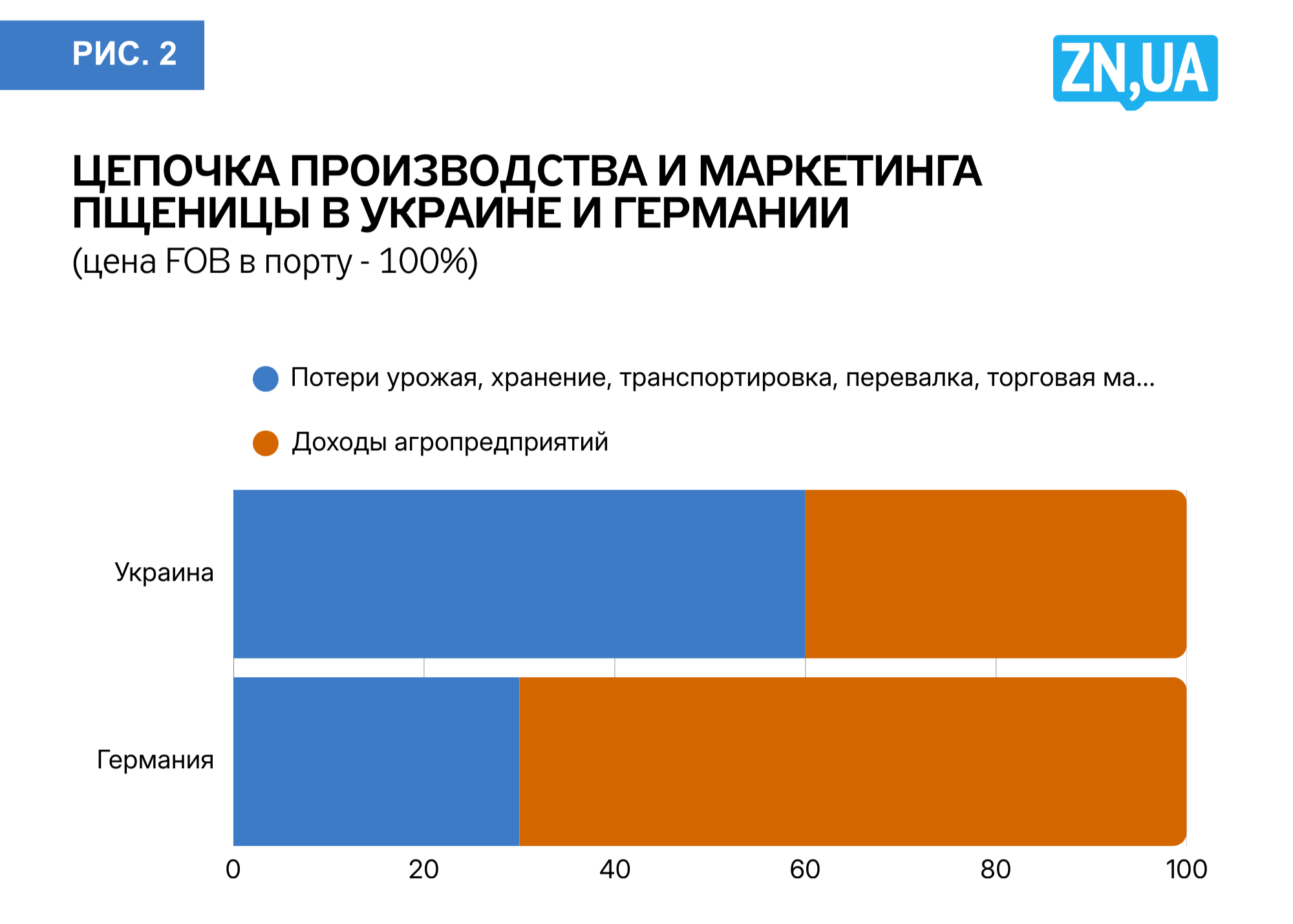 В Украине кооперативы не получили значительного развития: их доля на аграрных рынках оценивается всего в 1%. Государственная поддержка малого и среднего бизнеса также в основном декларативная. В свое время эксперты Немецкой консультативной группы при правительстве Украины сравнили цепочку производства и маркетинга пшеницы в Украине и Германии (см. рис. 2). Выяснилось, что украинские производители при экспорте пшеницы получают 40% от ее цены на мировом рынке, тогда как немецкие фермеры — 70%. Частично это объясняется большими потерями при уборке и хранении в нашей стране, но более важную роль играют другие факторы: большие затраты на хранение, перевозку зерна, перевалку в портах, высокие торговые надбавки.