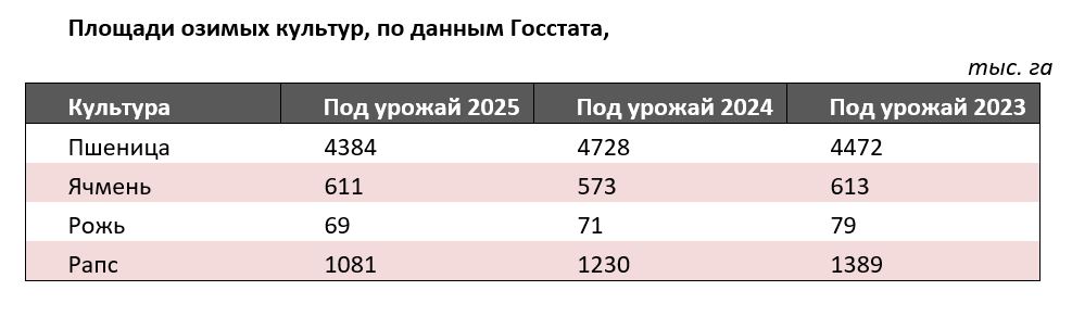 Еще несколько цифр. У нас есть дополнительно к пшенице три озимые культуры: ячмень — 611 тыс. га (площадь посевов), рожь — 69 тыс., рапс — 1,08 млн га. Цифры откорректируются весной, когда будут окончательная статистика и понимание того, как перезимуют поля.