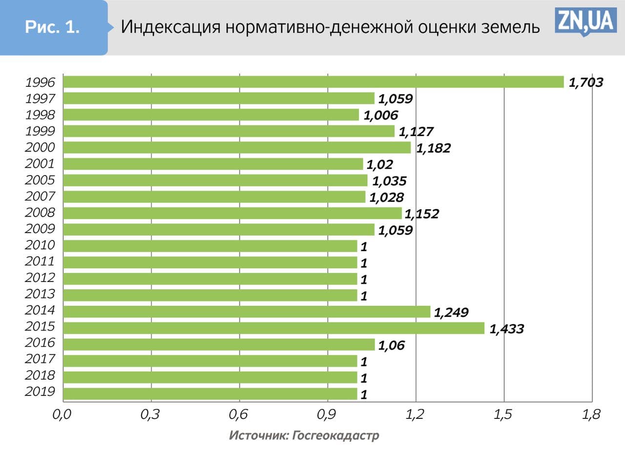Согласно постановлению Кабинета министров Украины от 12.05.2000 №783 «О проведении индексации денежной оценки земель» (с 1995-го по 2010-й) и пункта 289.2 Налогового кодекса Украины (начиная с 2011 года и далее) нормативная денежная оценка земель индексируется на соответствующий коэффициент (по годам, где проводилась индексация).