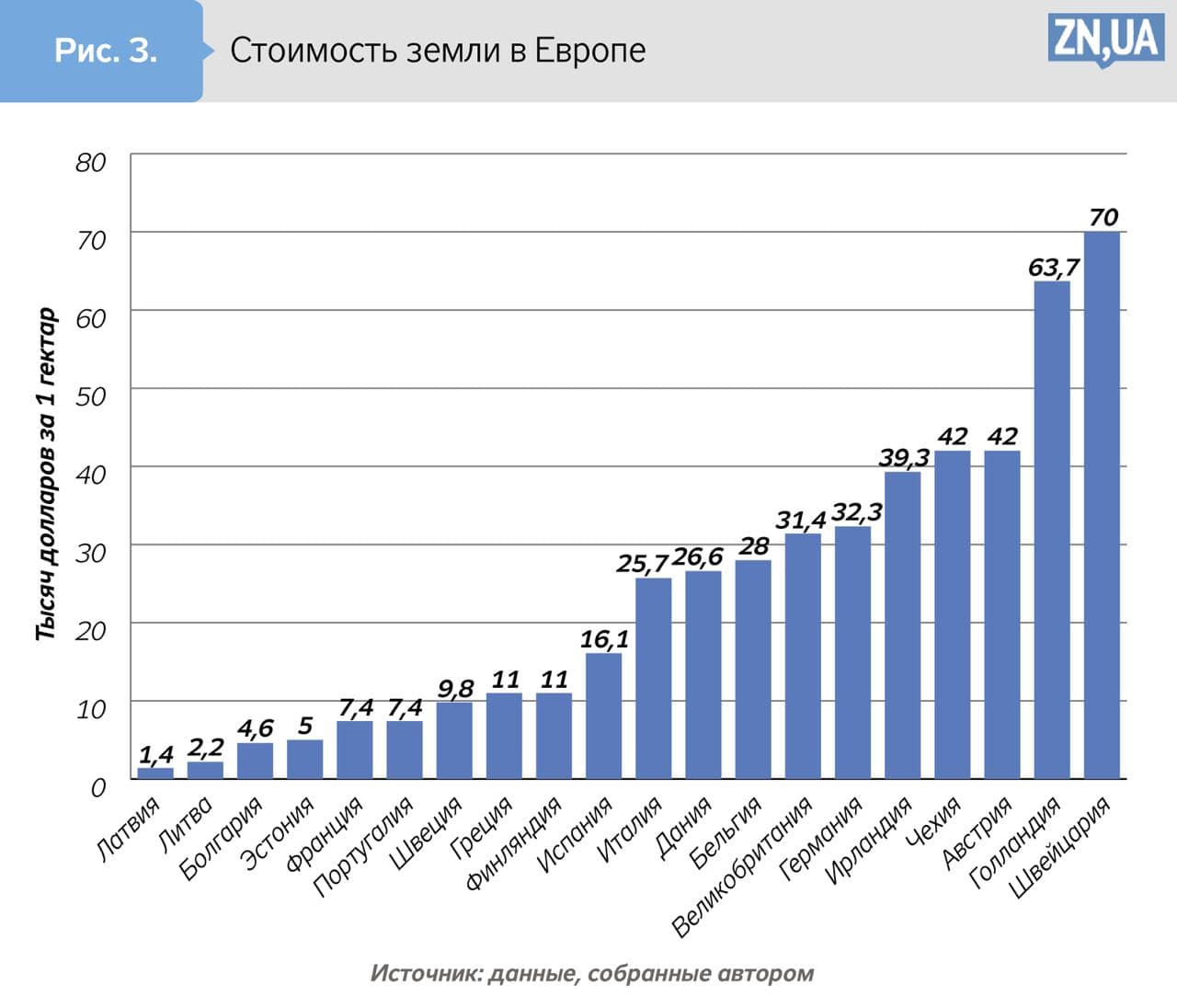 По мнению чиновников, именно с запуском рынка земли эти показатели претерпят существенные изменения. При открытии рынка земли один ее гектар будет продаваться на уровне 2200 долл. Об этом еще осенью прошлого года заявил заместитель министра развития экономики, торговли и сельского хозяйства Тарас Высоцкий. Эта цифра намного превышает независимую денежную оценку земель сельскохозяйственных угодий. Но по сравнению с ценами на земли в Европе она ничтожно мала (см. рис. 3).
