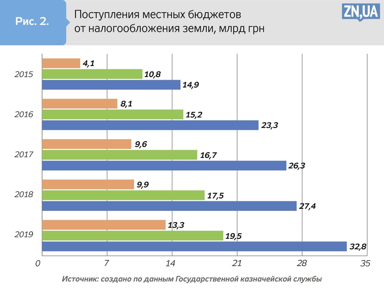 Располагая базой для расчетов ставок налогов и аренды за пользование землей и оперируя данными Государственной казначейской службы, можно легко определить удельный вес этих сборов для местных бюджетов. Так, в 2018 году органы местного самоуправления к своим бюджетам получили 27,3 млрд грн от платы за землю. В 2019-м сумма таких поступлений достигла уже свыше 32,8 млрд грн (см. рис. 2). На первый взгляд, это может показаться большой суммой, но предлагаю не спешить с таким выводом.
