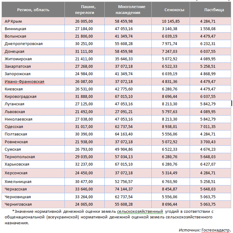 11 января 2020 года Госгеокадастр опубликовал справочник показателей нормативной денежной оценки сельскохозяйственных угодий в Украине по состоянию на 1 января 2020 года (см. табл.). Стоимость земель в зависимости от их назначения и местоположения существенно отличается. Если, например, в Черкасской и Черновицкой областях гектар пашни стоит свыше 33 тыс. грн, то во Львовской, Волынской и Житомирской — немногим более 20 тыс. Но в любом случае орган, уполномоченный на заключение договора аренды угодий по состоянию на момент передачи их в коммунальную собственность, не нарушил действующую норму Налогового кодекса, устанавливая размер платы. Также, видимо, ни у кого не вызывает сомнений несколько неадекватный размер такой платы. По моему мнению, она слишком низкая. Почему? Потому что база налогообложения (нормативная денежная оценка) и ставки тоже маленькие.