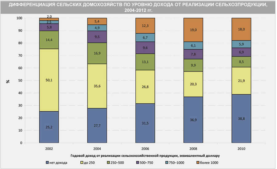 В частности, в 2012 г. почти 17% ЛКХ имели доход от продажи сельскохозяйственной продукции, в эквиваленте превышающий 1000 долл. (в США этот уровень дохода является критерием отнесения домохозяйства к фермерскому хозяйству); средний размер этого дохода составлял 17,7 тыс. грн. Среди них приблизительно 1% имели поступления от реализации произведенной продукции свыше 30 тыс. грн. Очевидно, что это те ЛКХ, которые присоединили земельные паи и с которых при продаже продукции может взиматься налог на доход физических лиц. Они могли бы быть заинтересованы в получении статуса физических лиц-предпринимателей и в переходе к уплате единого налога при уменьшении его ставки до 3% от дохода (1% при одновременной уплате еще и НДС). Следует отметить, что взимание с ЛКХ, присоединивших земельные паи, налога на доход с физических лиц является необоснованным, ведь валовой доход (выручка) от реализации сельхозпродукции не может рассматриваться как чистый доход, поскольку в его структуре наибольшая доля приходится на материальные затраты.