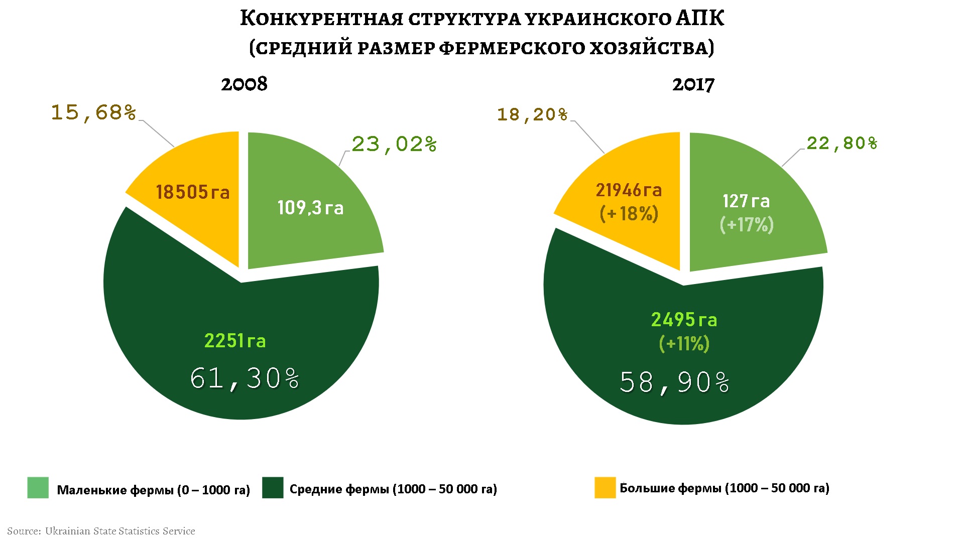 С другой стороны, для крупных компаний от 50 тыс. га нет проблемы в привлечении гораздо более дешевых ресурсов на мировых рынках капитала через эмиссию еврооблигаций или выход на IPO. Подобное неравенство возможностей уже привело к существенной олигополизации украинского АПК. Помимо ярко выделяющихся кейсов компаний с одними из самых крупных земельных банков в мире (Кернела - 550 тыс. га, Укрлендфарминга - 500 тыс. га и NCH - 400 тыс. га) важно обратить внимание и на общеотраслевые показатели. Только за 2009–2017 гг. произошло существенное укрупнение во всех трех категориях фермерства: на 18% больших (с более чем 10 тыс. га в обработке), 17% малых (до 1 тыс. га) и 11% средних (от 1 до 10 тыс. га). То есть происходит повышение барьеров для начала фермерской деятельности и ослабление конкурентной борьбы между текущими операторами рынка.