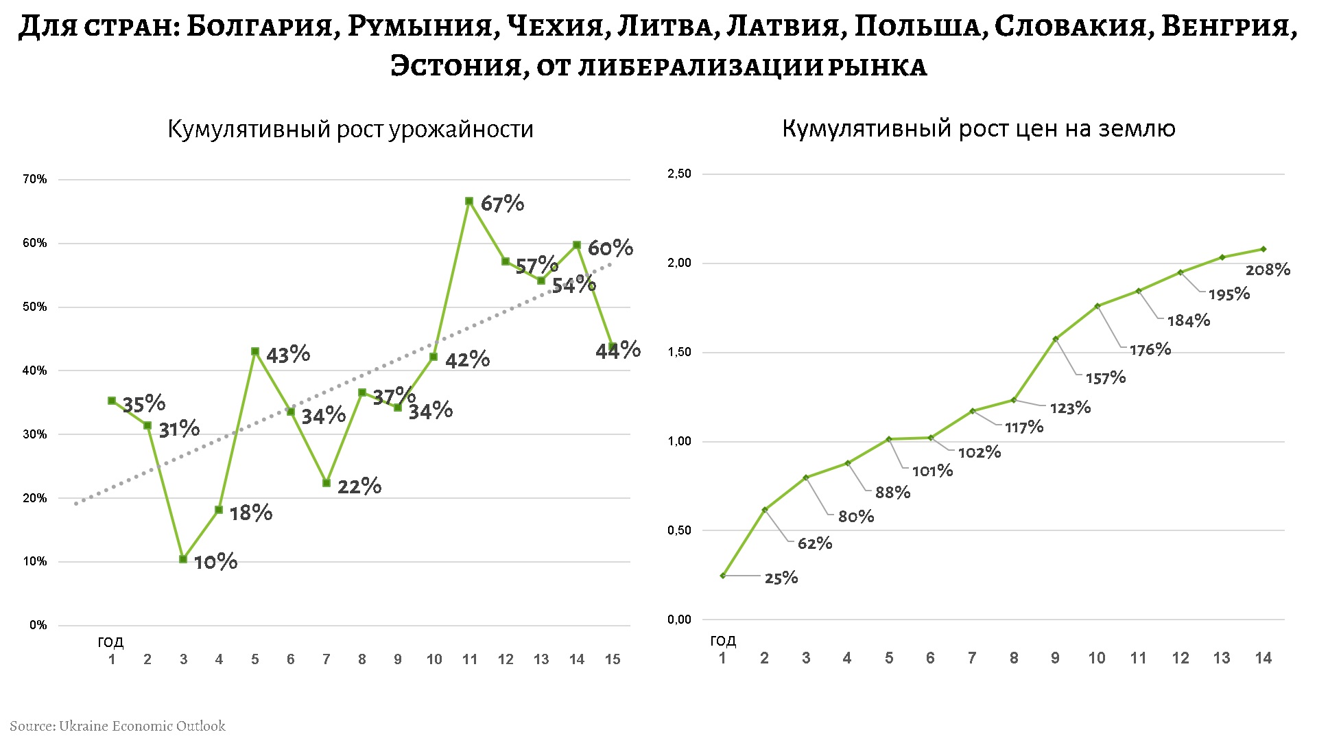 Кумулятивный прирост цен на землю в Восточно-европейском поясе стран, отображающий ее доходность как бизнес-единицы, по сравнению с 2003 г., составил 208%. При этом, в отличие от "старой Европы", основным фактором роста цен выступило увеличение урожайности (в среднем на 53%) и улучшение структуры производства в сторону сложных и дорогих культур. Земля, где растет пшеница первого сорта, гораздо дороже аналогичной с фуражными видами, не говоря о высокомаржинальных подотраслях растениеводства.