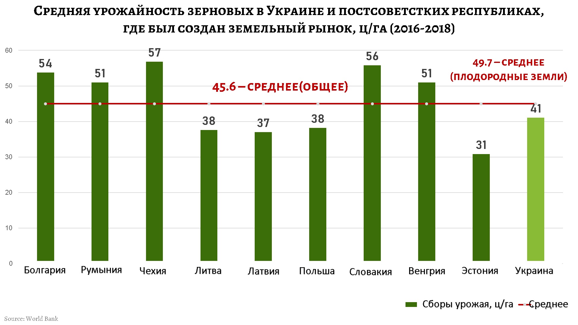 В то же время Украина, земля с наилучшими стартовыми возможностями, сегодня собирает в среднем 41 центнер зерновых с гектара, что ниже на 11% показателей постсоветских стран Восточной Европы. Если же отбросить страны Прибалтики, где качество пашни несравнимо хуже, то разрыв в урожайности вырастет до 21%.