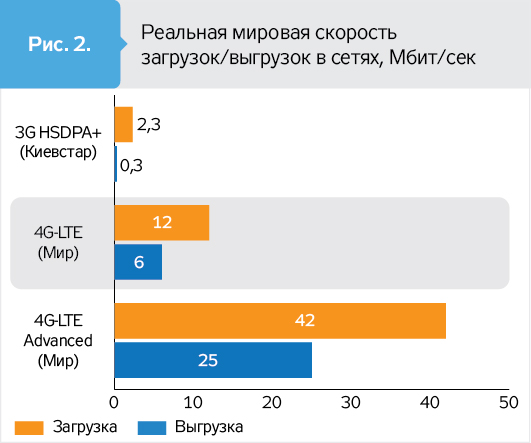 Средняя скорость в сети 4G выше в 5-10 раз по сравнению с самыми современными сетями 3G/HSPA. Особенно выросла скорость выгрузки контента - до 25 Мбит/с (практически до 100 раз) для сетей LTE Advanced.
