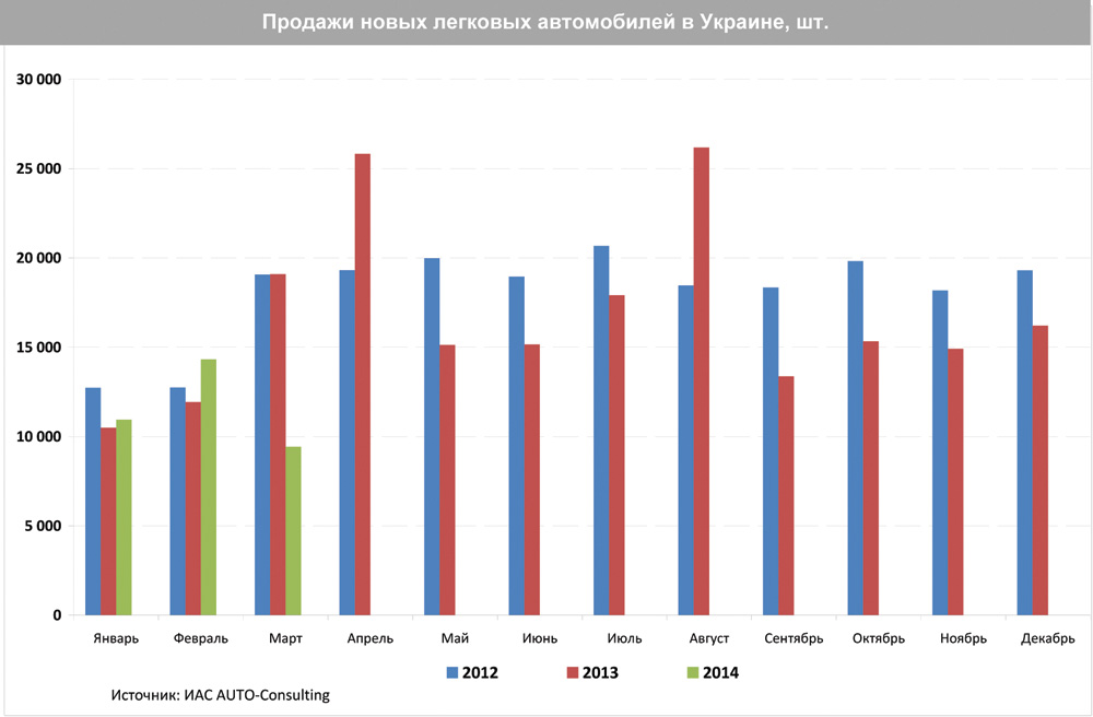 По данным информационно-аналитической службы AUTO-Consulting, в первом квартале 2014 г. продажи новых легковых автомобилей в Украине упали на 16,4%. Следует понимать, что столь неглубокое падение получилось за счет активных продаж в январе-феврале, когда курс доллара только начинал расти. В марте продажи уже рухнули на 51%, а в апреле-мае тенденция на фоне дальнейшего ослабления национальной валюты, аннексии Крыма и войны на Востоке только усугубилась. Дошло до того, что представители компаний "Атлант-М Юг" (дилер Renault) и "Еврокар" (Skoda) в период стремительного обвала национальной валюты даже заявляли о приостановке продаж конечным потребителям в связи с невозможностью зафиксировать цены в национальной валюте.