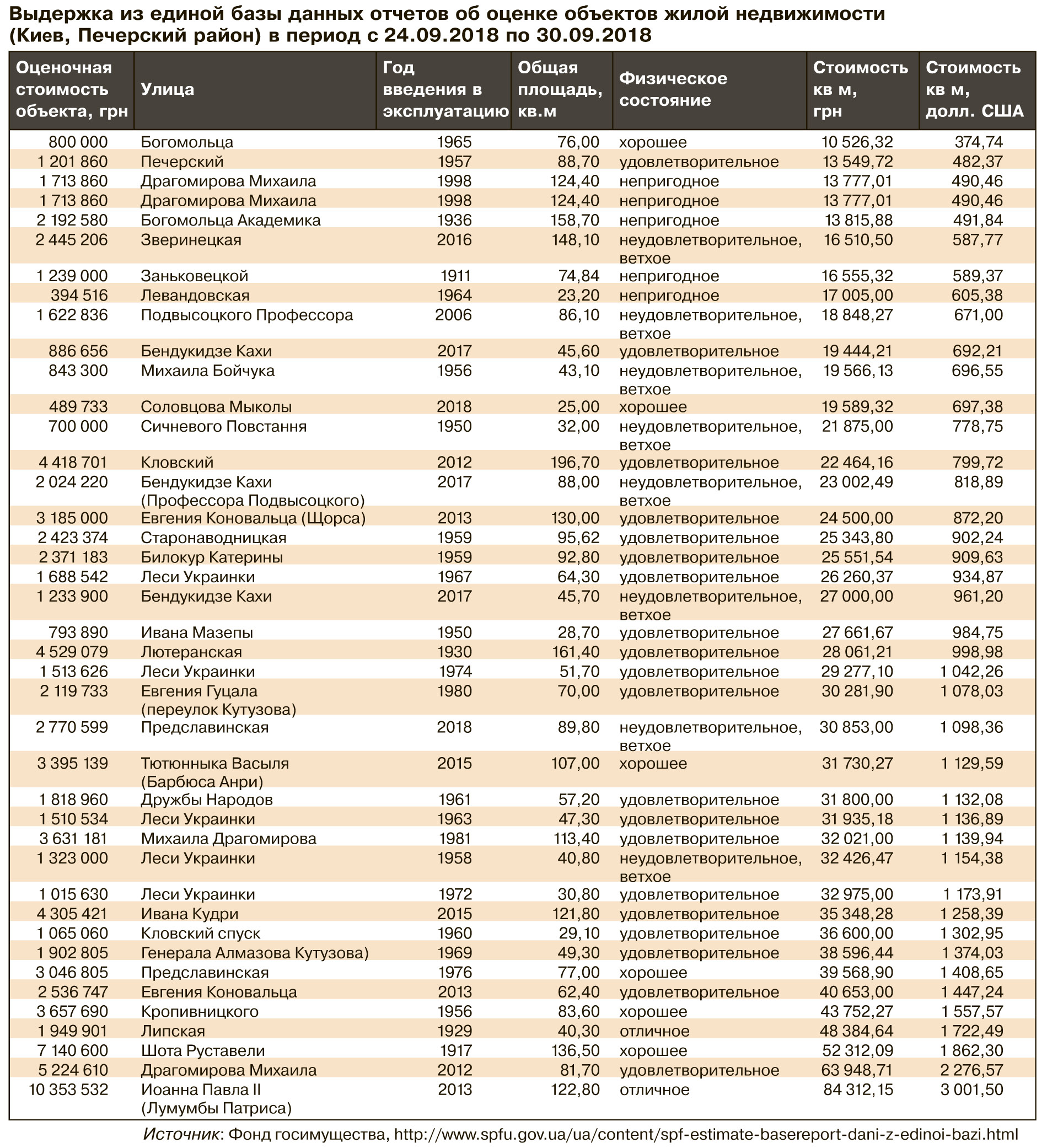 Мы приводим таблицу, в которой выбраны официально опубликованные данные на сайте Фонда госимущества. В последней колонке видны те стоимости квадратного метра, которые "чудо-Модуль" разрешил зарегистрировать в единой базе. Мы выбрали те квартиры в многоэтажных домах, которые расположены в Киеве на Печерске. Читатель может получить огромное удовольствие от созерцания этих цен…