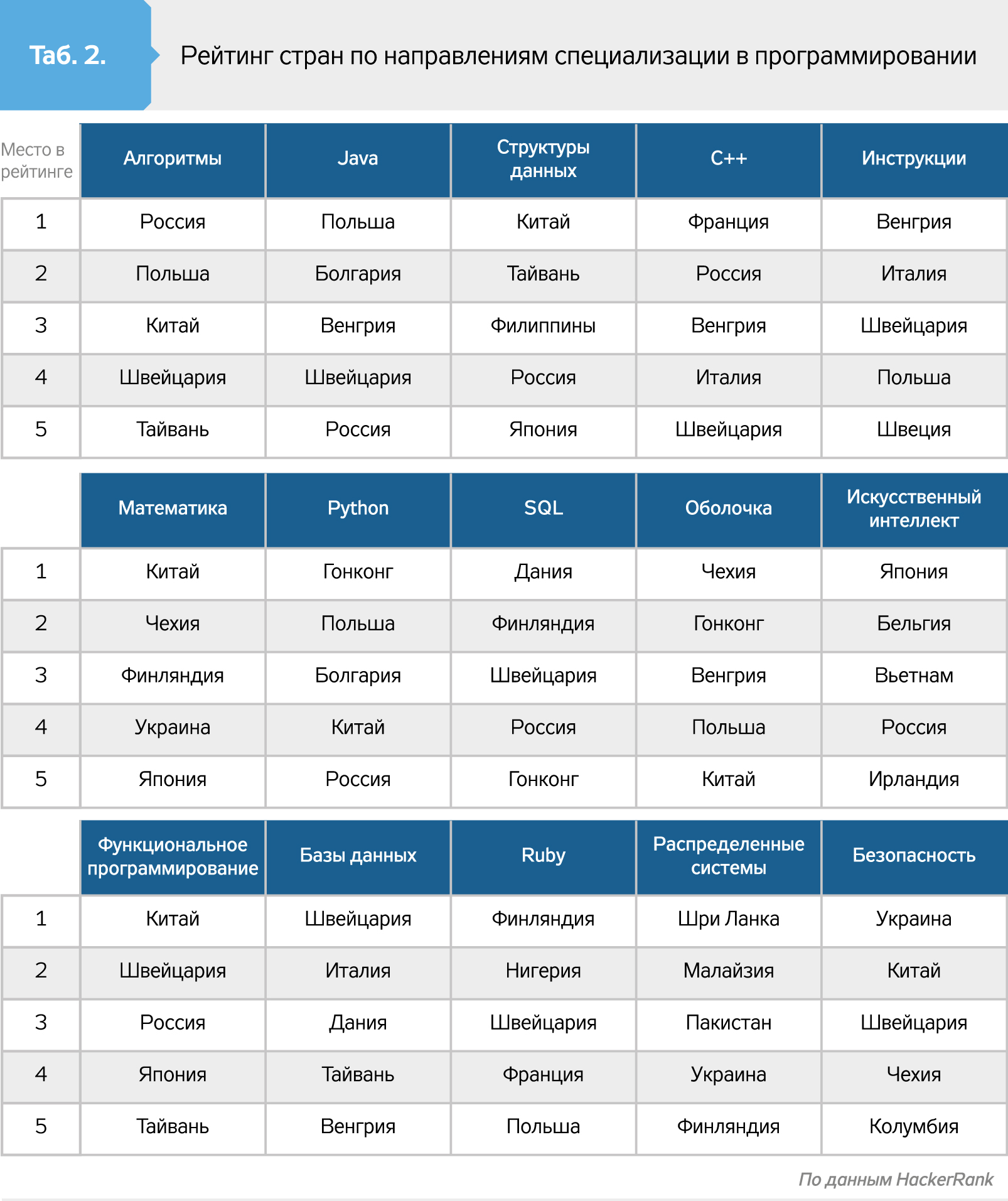 Ресурс по трудоустройству HackerRank составил рейтинг лучших программистов в разрезе стран. По его данным, Украина занимает 11-е место в мире по квалификации программистов. Если же рассматривать достижения по направлениям специализации, то отечественные программисты лидируют по кибербезопасности (!), занимают четвертую позицию в математике и распределенных системах.