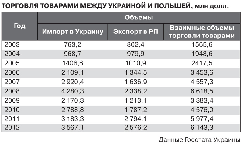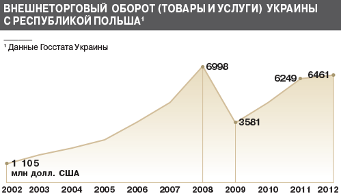 Как сообщил корреспонденту ZN.UA советник-посланник, руководитель отдела по экономическим вопросам посольства Украины в Республике Польша Тарас Токарский, по результатам 2012 г. объемы внешней торговли товарами Украины с Республикой Польша составили 6143,3 млн долл. США и, по сравнению с 2011 г., увеличились на 2,8%. При этом уровень украинского экспорта в РП составил 2576,2 млн долл. и, по сравнению с аналогичным периодом 2011 г., уменьшился на 7,8%. Уровень польского импорта в Украину возрос на 12,1% - до 3567,1 млн долл.