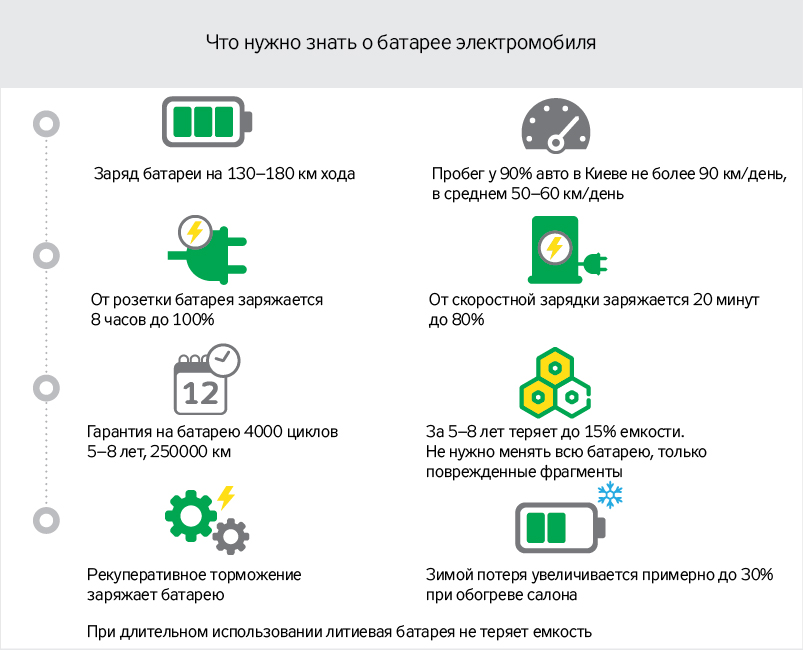 По данным AUTO-Consulting, средний суточный пробег автомобиля в Киеве не превышает 60–80 км в день. Батарея электромобиля обеспечивает 130–180 км пробега, поэтому достаточно заряжать ее каждую ночь, чтобы потом весь день перемещаться по городу.