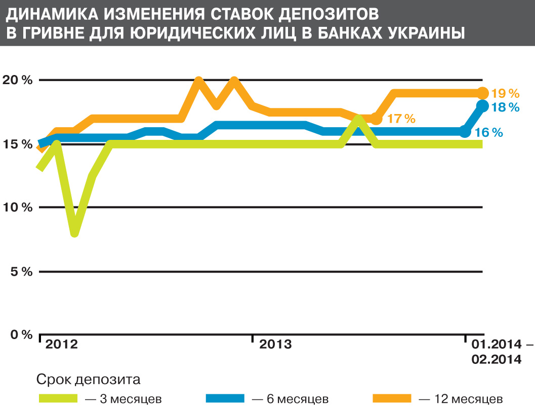 Ситуация с вкладами бизнеса более спокойная. По депозитам юридических лиц сейчас также наблюдается тенденция к росту ставок, правда, не такая заметная, как по депозитам, предлагаемым частным клиентам. Наибольшей популярностью у бизнеса в это тревожное время пользуются и краткосрочные депозиты. Но ставки по ним банкиры поднимать не спешат. Они по-прежнему находятся в диапазоне 15-16%. В то же время большинство банков в конце февраля т.г. довело свои депозитные программы сроком на год до уровня 20% годовых. При этом ставки выше 20% годовых имеют уже пять учреждений из числа крупнейших: "Финансовая Инициатива", VAB Банк, Имэксбанк, ПриватБанк (срок от 12 месяцев) и банк "Финансы и Кредит" (до 23% годовых).