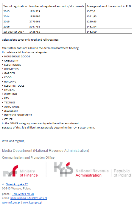 А по данным Минфина Польши, добытых моим коллегой Всеволодом Некрасовым, количество ввезенных товаров по беспошлинной норме до 500 евро в ручной клади только через границу с Польшей увеличилось с 1 856 396 ввозов в 2014 г., до 3 047 731 ввозов в 2016-м, в среднем на 360 евро каждая.