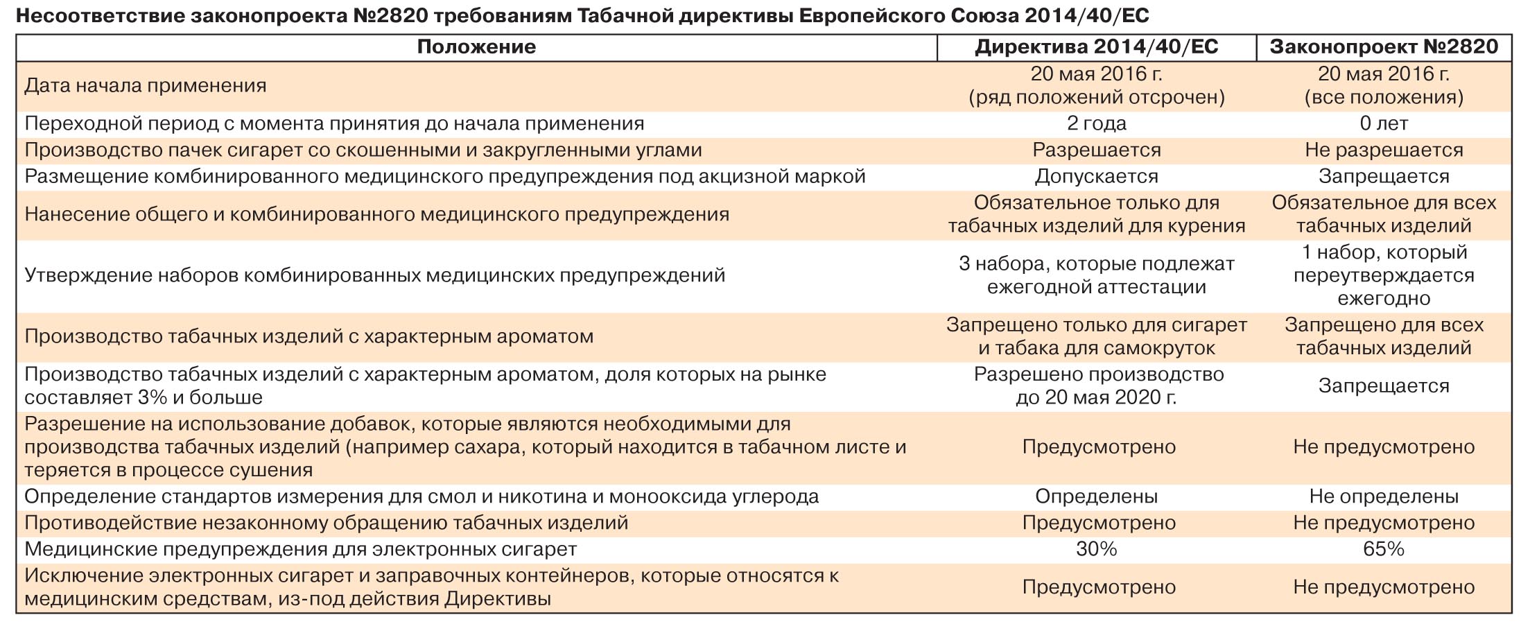 Кроме того, размещение на упаковке табачных изделий комбинированных медицинских предупреждений, предусмотренных законопроектом, требует перенесения акцизных марок на другую часть упаковки (они не должны перекрывать предупреждение и в то же время должны разрываться при открытии упаковки). Но переходного периода для их перенесения законопроект не предусматривает (даже несмотря на то, что Директива предоставляет дополнительные три года переходного периода для такого перенесения).