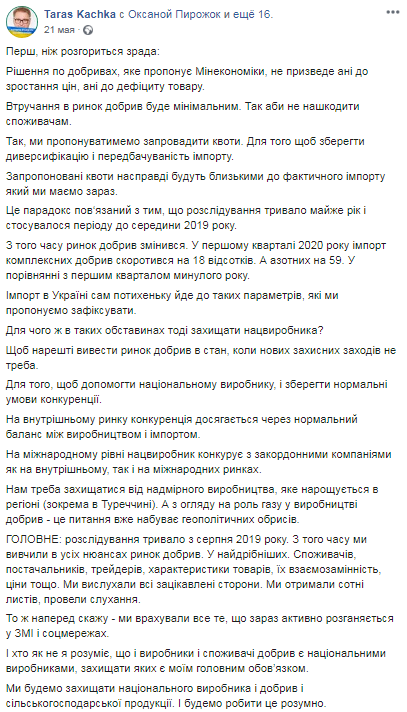 Как уже было отмечено, с августа 2019-го по май 2020-го Минэкономики провело два расследования. 21 мая, за день до заседания Межведомственной комиссии по международной торговле, торговый представитель Украины Тарас Качка заявил в Фейсбуке, что квоты будут введены на ближайшие три года (см. скриншот поста).
