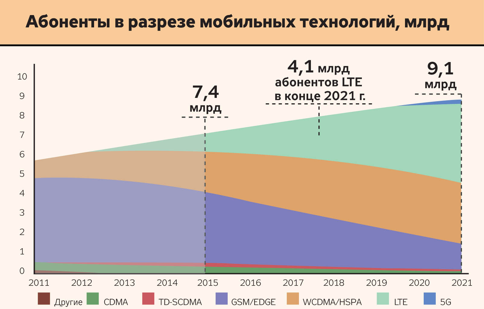 Первым мобильным оператором, который уже в этом году запустит тестовую 5G-сеть, является американский Verizon. Первые же полноценные коммерческие сети 5G появятся только в 2019 г. На диаграмме это обозначено маленькой зарождающейся серой черточкой первых миллионов 5G-абонентов.