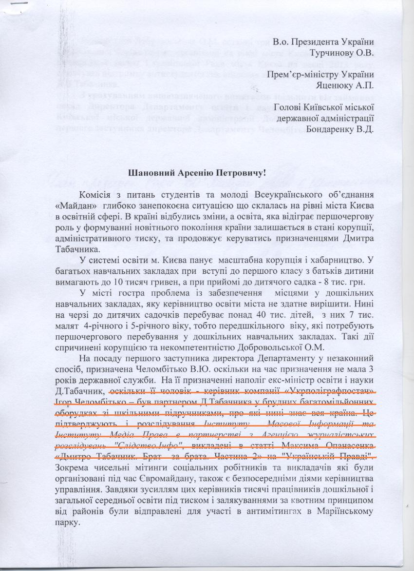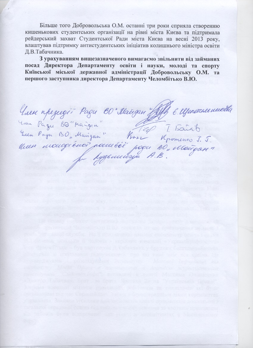 В распоряжении редакции ZN.UA есть также письмо Комиссии по вопросам студенчества и молодежи Всеукраинского объединения Майдан к А. Турчинову, А.Яценюку и В.Бондаренко. "В країні відбулися зміни, а освіта, яка відіграє першочергову роль у формуванні новітнього покоління країни, залишається в стані корупції, адміністративного тиску та продовжує керуватись призначенцями Табачника." В письме подчеркивается, что в системе образования Киева господствует масштабная коррупция и взяточничество. Студенты-активисты подчеркивают, что, кроме прочего, руководитель столичного образования Оксана Добровольская способствовала созданию карманных студенческих организаций и поддерживала рейдерский захват Студенческого Совета в Киеве весной 2013 года.