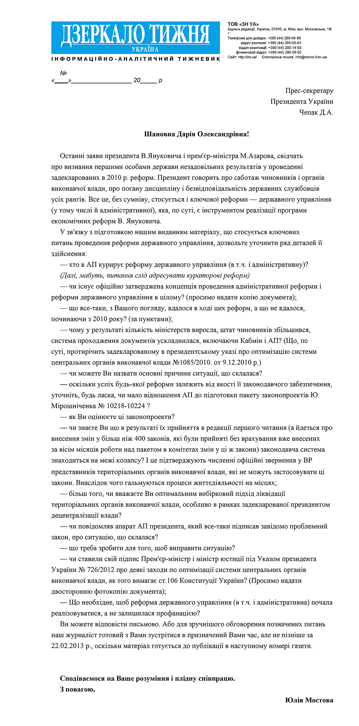 Аргументируем. По сути, с подачи Мирошниченко (точнее, Банковой), предложено отдать систему территориальных органов в ручное управление президенту. То есть, хочет гарант - реорганизует областную инспекцию, скажем, рыбнадзора, а вот экологическую службу вообще - ликвидирует. В любом регионе. Указом. Однако такой подход противоречит Конституции (ст.19) и закону о Кабмине, где черным по белому написано, что органы государственной власти, местного самоуправления… должны действовать на основании, в рамках и способом, определенными Конституцией Украины и законами. А об указах президента там ничего не сказано. Точнее сказано, что президент издает их на основе Конституции и законов. Точка.