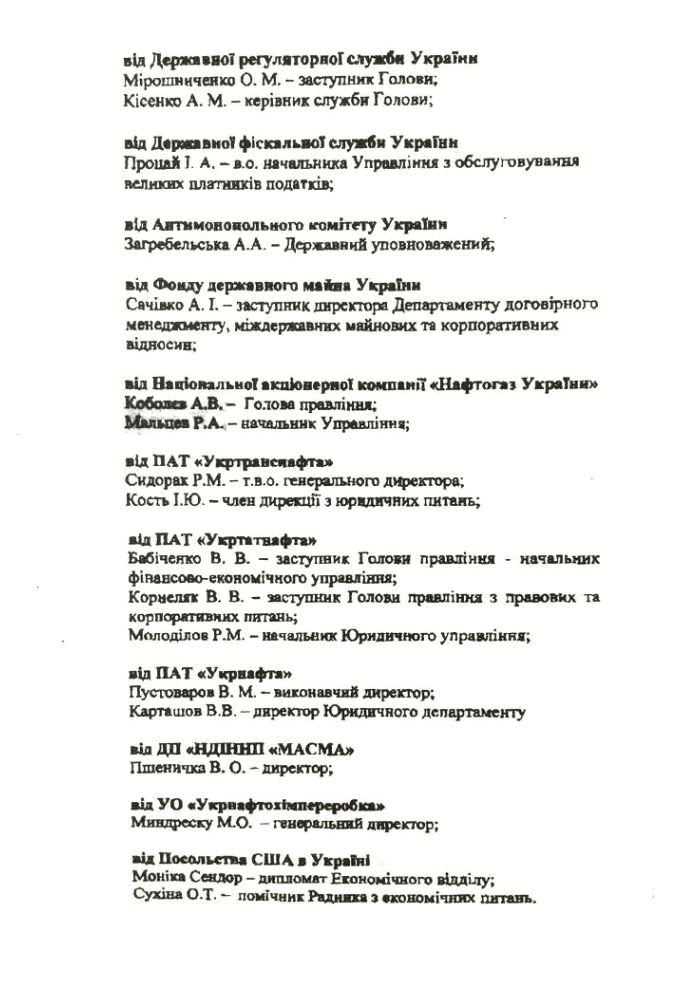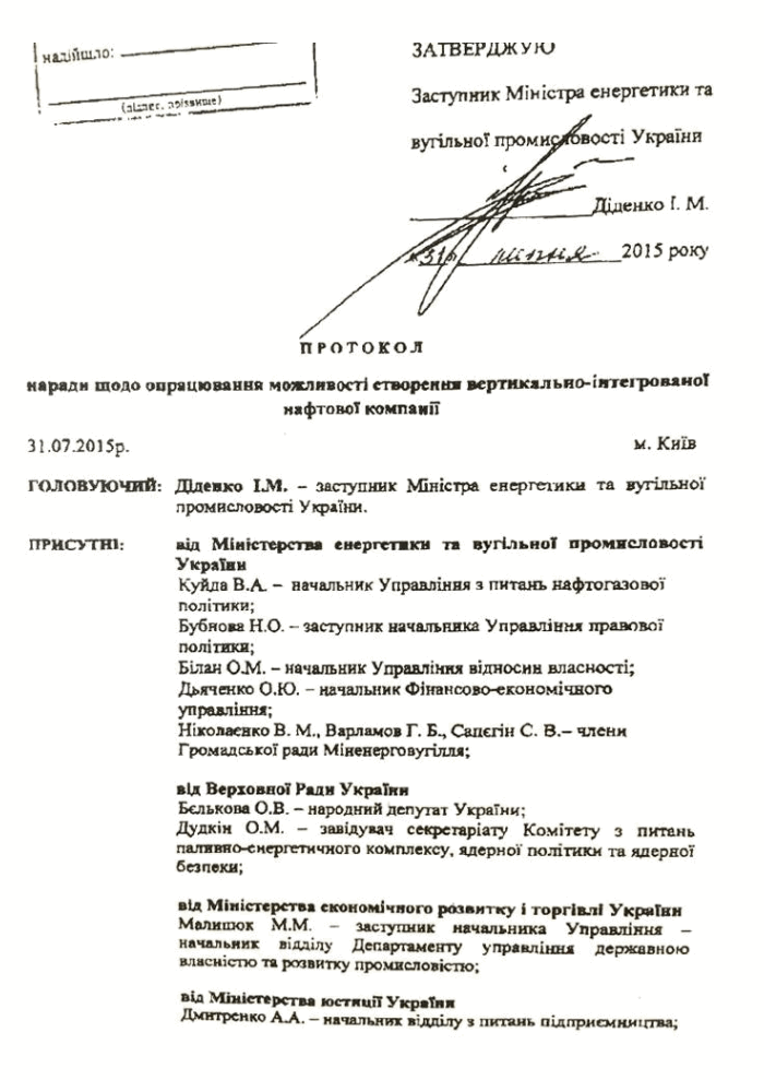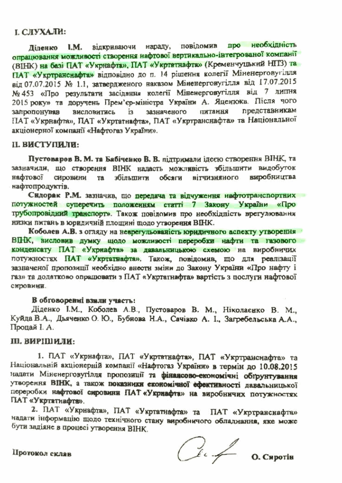 Как следует из протокола совещания "относительно проработки возможности создания вертикально интегрированной нефтяной компании" от 31 июля 2015 г., представители контролируемых "Приватом" "Укрнафты" и "Укртатнафты" полностью поддержали создание ВИНК. Руководитель "Укртранснафты" Роман Сидорак указал, что такое объединение противоречит Закону "О трубопроводном транспорте", глава НАК "Нафтогаз Украины" Андрей Коболев поднял вопрос об экспериментальной давальческой переработке нефти "Укрнафты" в Кременчуге.