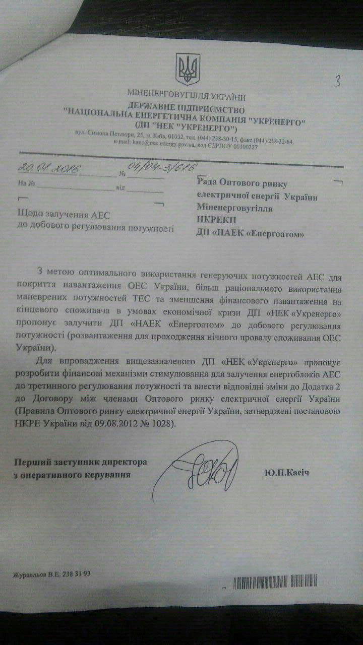 В распоряжении редакции DT.UА находится письмо, которое Национальная энергетическая компания "Укрэнерго" в январе направила в Оптовый рынок электрической энергии Украины, Министерство энергетики и угольной промышленности, Национальной комиссии, осуществляющей государственное регулирование в сфере энергетики и коммунальных услуг национальную энергетическую компанию "Энергоатом". Последней предлагается присоединиться к суточному регулированию мощности (разгрузки для прохождения ночного провала потребления Объединенной энергетической системой Украины).